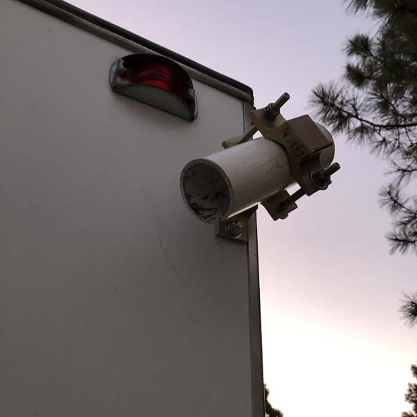 Phase III (Complete) Jim, N6KZ gave our club some items to use in our new trailer. Included was a mast pivot mount. KG7OH mounted the pivot at the top, back of the trailer and then clamped a larger PVC pipe as a sleeve. This allowed an extendable aluminum mast to be slid up through the pipe sleeve. Then we could attach the tri-band to the mast, and using the "armstrong method", raise or lower the antenna. It only takes a few minutes, once the beam is mounted on the mast. And easy, simple, fast way to get on the air.
